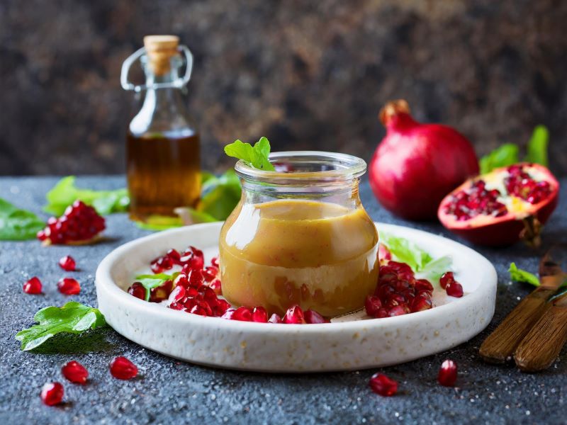 A tangy-sweet blend of pomegranate and maple syrup, perfect for a fresh salad twist