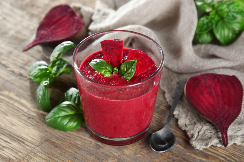 - Place beets, strawberries, apples (with peel), water, and ice cubes into a blender and puree until smooth.