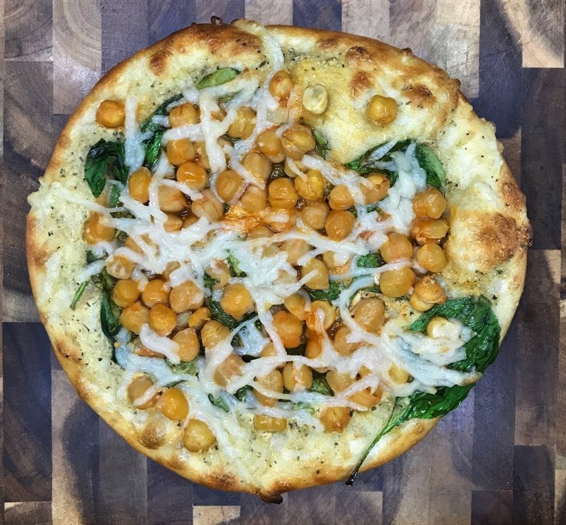 - To assemble: On a lightly floured surface, place dough ball and press down and flatten. Pressing from the center outward, start to stretch the dough slowly and evenly, don't tear the dough. Create an 8 inch circle. Flour a pizza peel and place the dough on the peel. Spread 2 Tablespoons of the sunflower garlic sauce on the dough, leaving about 1/4 inch border from the edge. Place 0.5 ounce of spinach around the dough. Add 2 ounces (1/4 cup) of the buffalo chickpeas on top of the spinach. Add 1 ounce (1/4 cup) of the non-dairy mozzarella cheese on top. Place in oven and bake, rotating to avoid burning any sides. Keep cooking for 3-4 minutes or until the dough is set, risen, and the toppings are melted and cooked. Remove from the oven, cut into slices and serve.