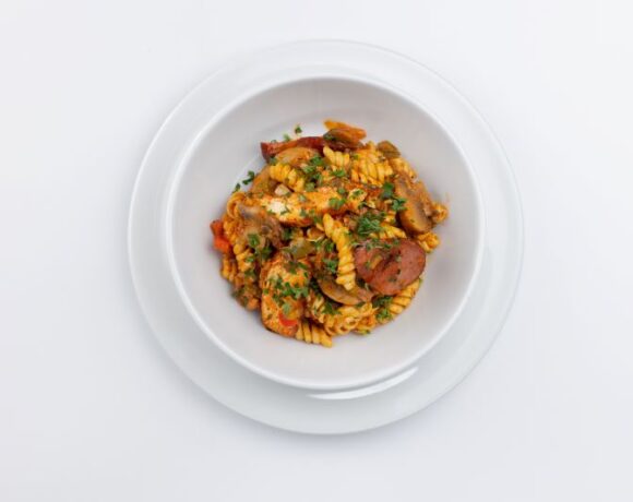 - In a bowl, ladle 8 oz. of Cajun pasta per serving and garnish with 1/4 tsp of chopped parsley.