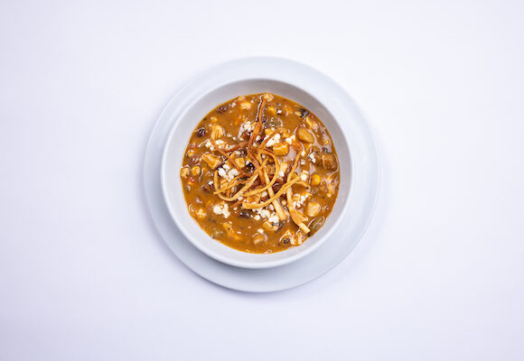 - Ladle 8 oz. into a serving bowl. Garnish each bowl of soup with 1 Tbsp. of tortilla strips and 1 Tbsp of cotija cheese.