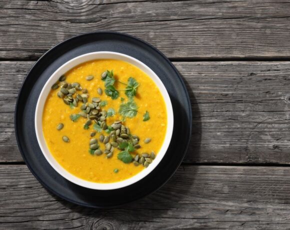 - Slice Guajillo Chilies in half. Ladle soup into bowls. Top each bowl with toasted pumpkin seeds, sliced chiles and chopped cilantro.