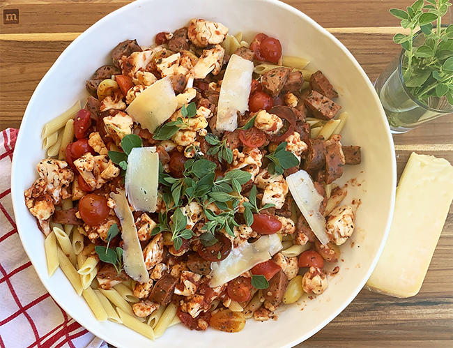 This Italian sausage with cauliflower & plum tomato sauce served over whole wheat penne is from our Teaching Kitchen program.
