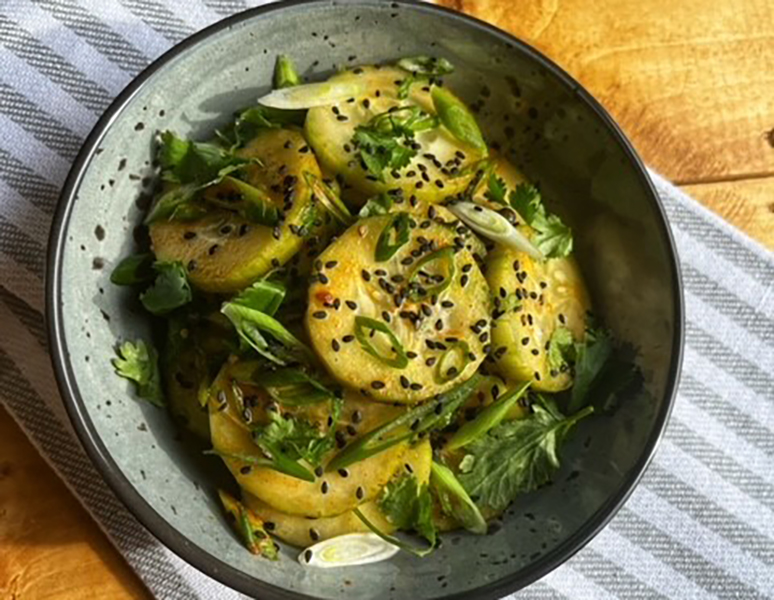 - Wash and peel cucumbers. Slice 1/8 in thick. Whisk oil with vinegar, red pepper paste, salt, sugar, and sesame seeds . Toss with cucumbers, scallions and cilantro.Rest for 10 minutes in refrigerator, then serve.