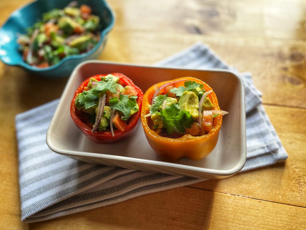 - Cut off the tops of the peppers and remove the membrane. Use tops for another application. Prepare a sheet tray with pan spray. Fill each pepper with 3/4 cup of tempeh filling. Bake in a 350F degree oven until heated through and peppers are softened, about 15 minutes. Remove from oven, top each stuffed pepper with about 2 tbsp. of avocado salad.