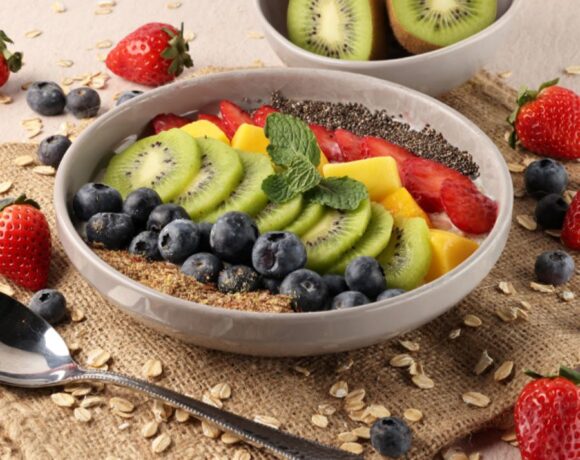 - Place 1 cup oat base in a bowl and top with: ¼ cup blueberries, 1 tsp flax seeds, 1 sliced kiwi, ¼ cup mango, 1 tsp chia seeds, and 2 sliced strawberries. Garnish with fresh mint sprig.