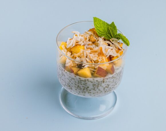 - Prepare coconut chia pudding by adding yogurt, coconut milk and chia seeds in a mixing bowl.
