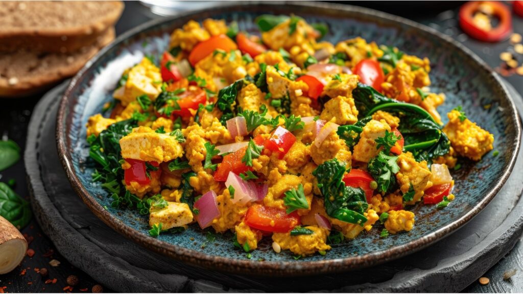 - Heat oil in a sauté pan over medium high heat. Add peppers and onions and sauté for approximately 6-8 minutes until tender. Add kale and sauté for an additional 2-3 minutes or until cooked through. Crumble tofu and add to sauté pan, cook until heated through. Stir in water/spice mixture and simmer.