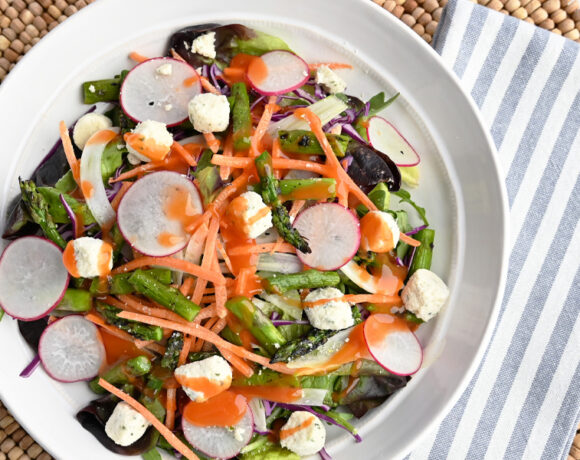 Arugula topped with grilled asparagus, radish, carrots, red cabbage and balsamic dressing with herbed boursin cheese