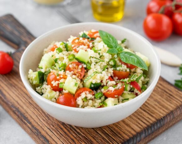 - Add prepared herbs, scallions, cucumber, and tomatoes to a mixing bowl and drizzle in olive oil. Zest the outside of the lemon into the mixing bowl with the vegetables, being careful not to scrape too far into the white pith. Once zested, cut the lemon in half and squeeze into the mixing bowl. Add the couscous, dried cranberries, salt and pepper to the bowl and mix thoroughly.