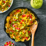 In a large bowl, toss tortilla chips with avocado salsa verde until all chips are coated evenly. In an oven safe serving vessel, layer chips, scrambled eggs, and shredded cheddar cheese. Bake at 350F until the cheese is melted. About 3-4 minutes.Once cheese is melted, remove chilaquiles from oven and garnish with onion, pepper, tomato, and diced avocado. Serve immediately.