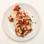 For the chicken: Pre-heat oven and pre-heat grill to medium high heat. Brush chicken with olive oil and season with salt and pepper. Place chicken onto the grill and cook for approximately 4 minutes on each side. Place the chicken on a sheet pan and place in the pre-heated oven until it’s cooked through and the internal temperature reaches 165F degrees.