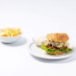 Toast the croissant. Once the croissants are toasted, place them on your cutting board or work surface. Top the bottom half with 1 lettuce leaf, then 2 slices of tomato, and 3 oz. of chicken salad. Finish with the top of the croissant. Serve with 2 oz. lemon basil mayonnaise on the side.