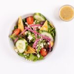 Then sprinkle the salad with 3 cucumber slices, 1 Tbsp. of pickled red onion, 1 Tbsp. of feta, 6 halves of grape tomatoes and 6 halves of Kalamata olives.