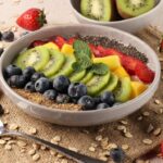 Place 1 cup oat base in a bowl and top with: ¼ cup blueberries, 1 tsp flax seeds, 1 sliced kiwi, ¼ cup mango, 1 tsp chia seeds, and 2 sliced strawberries. Garnish with fresh mint sprig.
